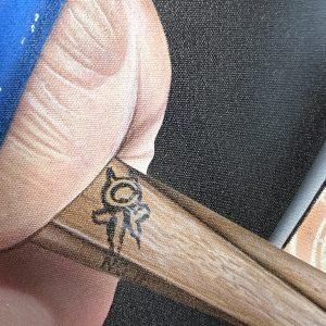 The title of each piece is often overlooked but may very well be the most important piece of the puzzle. Stickman looks for a lyric that he believes personifies the subject or his feeling toward that subject, and then strives to create an image and feeling that takes the viewer to that emotional state of mind. The titles are always a lyric from the song of inspiration, but rarely the title of a song. If the viewer is a fan of the song, they should almost hear the lyric or feel the emotion of the lyric when looking at the piece. Knowing the title completes the emotional connection to the painting.”